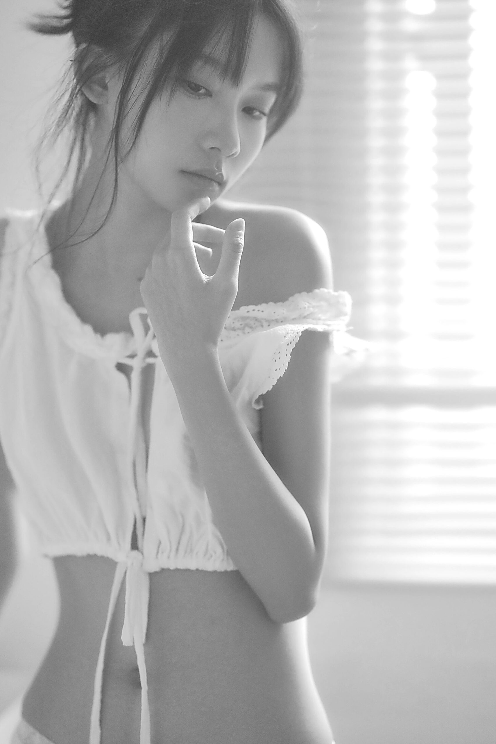 - Ánh sáng mờ ảo: Những vệt nắng xiên qua rèm cửa tại các studio/căn hộ ở Thủ Đức tạo nên một lớp filter tự nhiên, ôm ấp lấy làn da và những đường cong mềm mại.